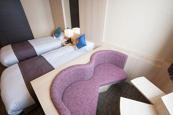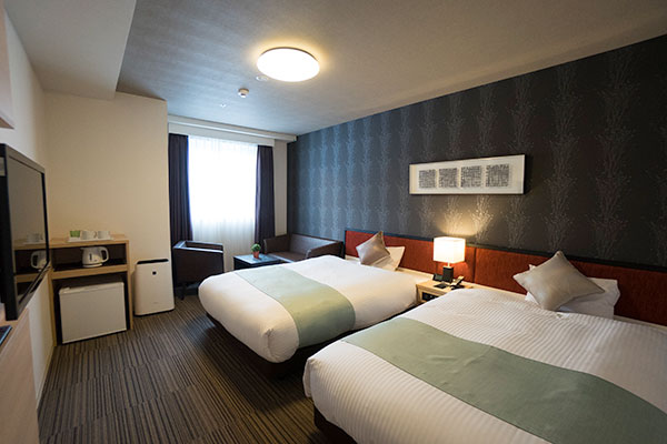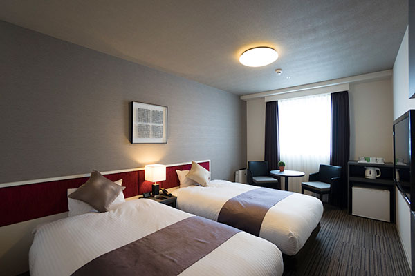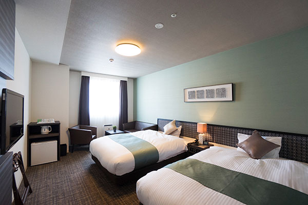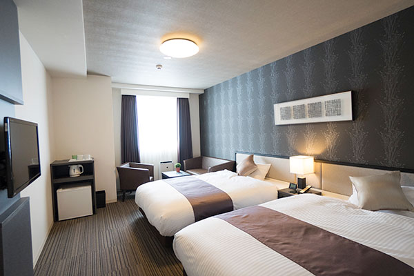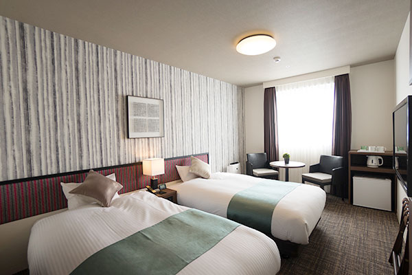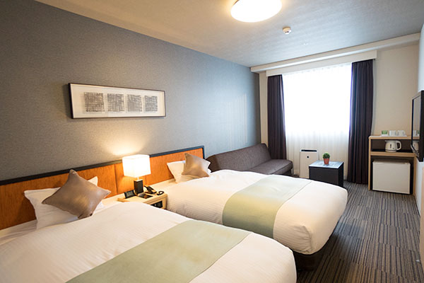 シンプルで清潔感のあるベッド2台のツインルーム。